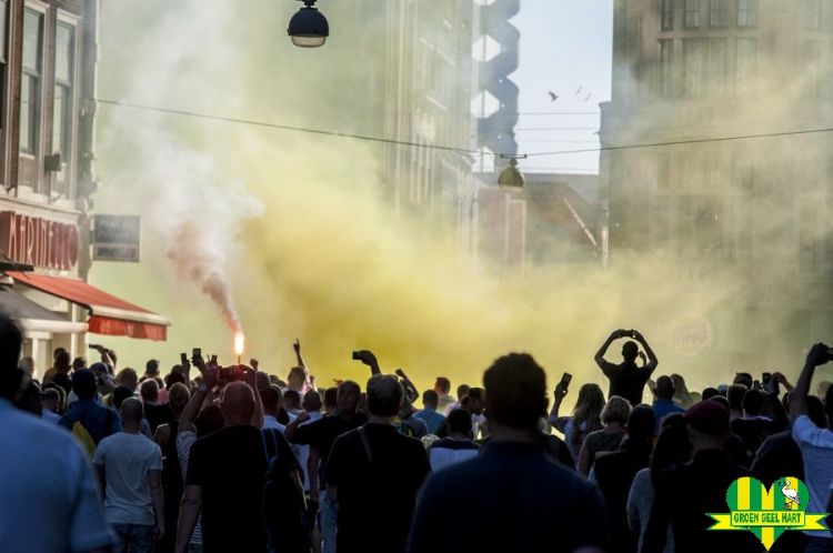 De sfeer op het Plein was gemoedelijk. Er werd, al dan niet in groen-geel shirt, een balletje getrapt en een drankje gedaan op een van de terrasjes. Daarna ging het in optocht naar het Spui. Onderweg werd gezongen en rookbommetjes en vuurwerk afgestoken. Het doel van de fanactie is bereikt, de politie was volop aanwezig.