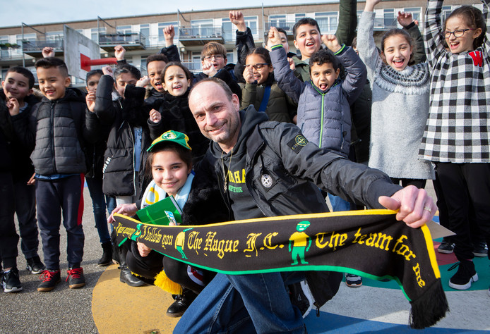Ja, wat doe je dan als beheerder van de supporterswebsite Northside.nl die ook nog eens net nieuwe mooie sjaals heeft laten maken en thuis een heel FC Den Haag museum heeft? Dan ga je zo’n jonge fan natuurlijk die nieuwe sjaal brengen. En je doet er nog een collectors item bij van oudere datum, een pet in de kleuren groen en geel, een speldje, wedstrijdboekjes en het boek dat je samen met andere supporters hebt geschreven over het legendarische ‘oude’ stadion in het Zuiderpark. Alles is Ranim gisteren aan het einde van haar schooldag in groep 5 van de Kameleon in de Ketelstraat omgehangen, opgezet en overhandigd.