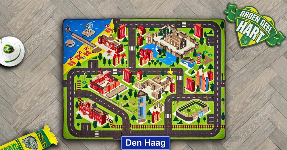 Pak de mini-auto er maar bij: het ritje van het ADO stadion naar de Pier is al snel anderhalve meter. De snelste route leidt langs de Haagse Tieten, Madurodam en de Hofvijver, waar de ooievaar rust. Via een alternatieve route kan ook langs het station Hollands Spoor of Noordeinde worden gereden. Het zijn allemaal iconen op een nieuw speelkleed voor speelgoedautootjes. Met dit speelkleed kunnen Haagse kinderen hun stad al vroeg verkennen op tapijt en lekker lang blijven hangen op de straten van Den Haag.