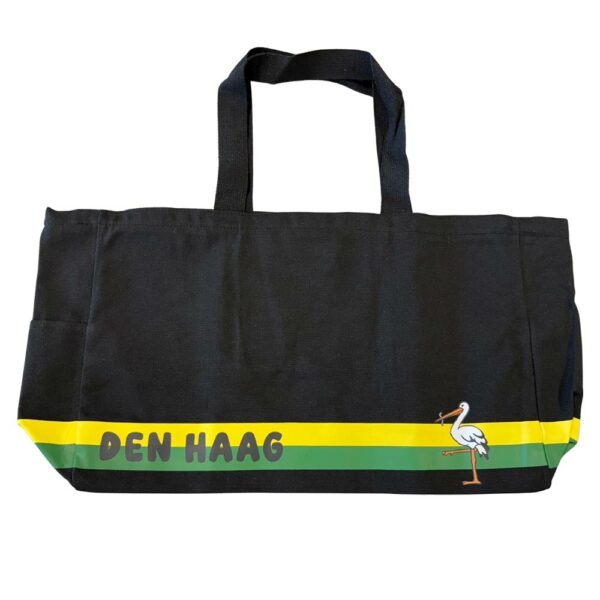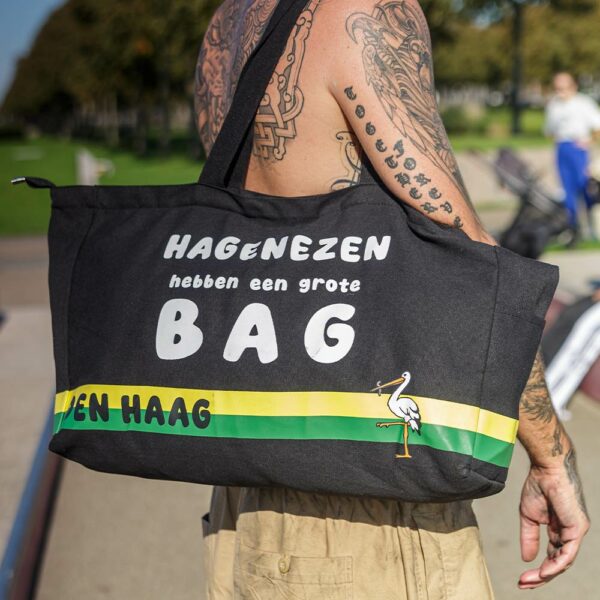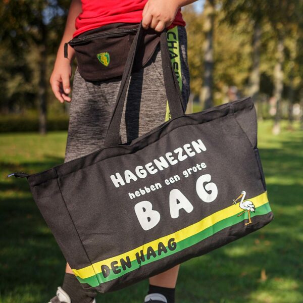 Deze unieke tas van groot formaat (52 cm x 33 cm x 14 cm) laat zich net als een Hagenees niet in een hokje plaatsen. Want of je nu gaat sporten, shoppen, op reis of naar het strand gaat, deze bag gaat overal met je mee! Daarom ook de tekst op het stevige canvas; ‘Hagenezen hebben een grote bag!’.