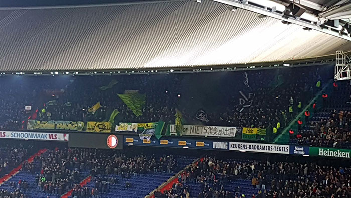 Voor velen was de niet uitverkochte Kuip een doorn in het oog. De afgelopen jaren was het stadion tijdens bekerwedstrijden vaak wel uitverkocht, maar woensdagavond was dat niet het geval. Gelukkig was het uitvak met 1200 Haagse supporters wel nokvol en daar was de sfeer dan ook opperbest.