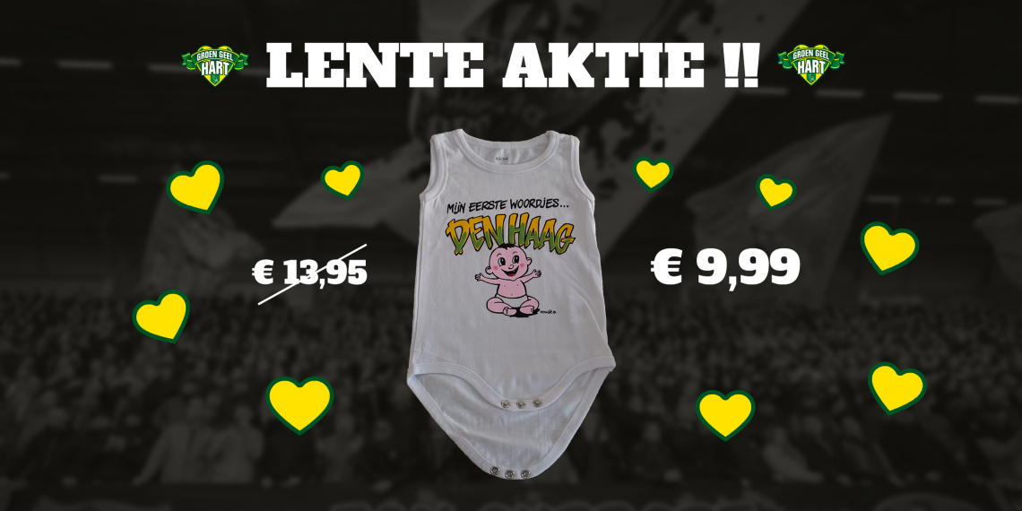 Ondanks de mindere resultaten blijft ons groengele hart altijd kloppen! Bij de ouderen, de jongeren en voor de allerjongsten gaan we dat met de paplepel meegeven. Dus profiteer nu van deze lente-aktie en bestel het originele Haags rompertje nu voor slechts € 9,99. (ex.verzendkosten, deze aktie loopt t/m zondag 24 maart) EN ONTVANG ER TEVENS EEN UNIEK HOUTEN GROENGEELHART ‘VOOR TROTSE HAGENEESJES’ -KLEDINGHANGER BIJ!